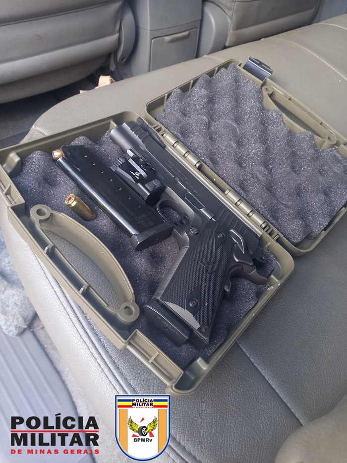 Procedida busca dentro da caminhonete foi encontrada, debaixo do banco do condutor, uma maleta escrito Taurus. Dentro da maleta foi localizada uma pistola calibre 45 municiada com um carregador com oito cartuchos intactos, inclusive com um cartucho dentro da câmara da arma, e outro carregador municiado com mais oito cartuchos intactos do mesmo calibre.