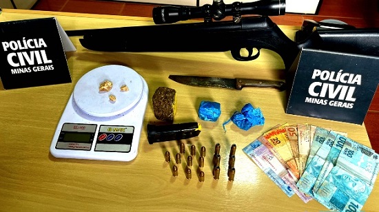 Durante a ação duas pessoas foram presas em flagrante, sendo um homem, de 37 anos, e uma mulher, de 32 anos. Na residência dos suspeitos, os policiais, acompanhados de cães farejadores, localizaram: dois tabletes e outras porções de maconha; porções crack; uma arma de pressão com mira telescópica; uma faca; uma balança de precisão; dois aparelhos celulares; dinheiro; e munições.