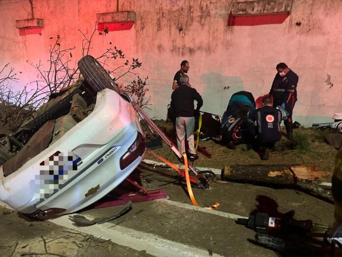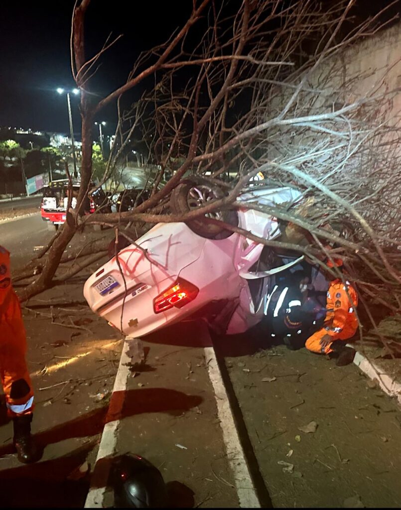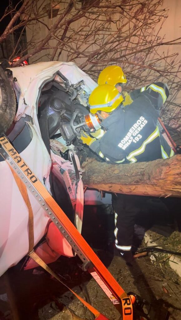 As equipes do Corpo de Bombeiros procederam com a estabilização do veículo e utilizaram ferramentas de desencarceramento e um motosserra para remover a árvore e acessar as vítimas.
