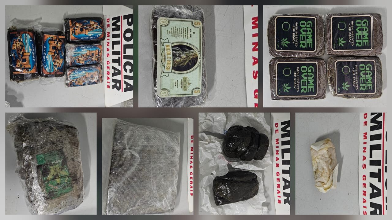 Uma busca no veículo revelou quatro barras de maconha prensada, quatro tabletes de maconha conhecida como “Game Over Dry”, cinco tabletes semelhantes a haxixe, uma bisnaga de maconha conhecida como “Ice”, duas bolas grandes de haxixe, uma barra de maconha tipo “Skank” e um pacote de maconha em flor chamada “Colombian Golden”. O suspeito informou que receberia dinheiro pelo transporte da droga até Patos de Minas.