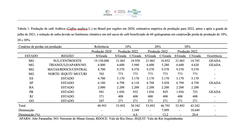Ainda é cedo para estimar-se a perda de produção para a safra de 2022 com grau de confiança aceitável. A última safra de bienalidade positiva e com clima favorável nas principais regiões produtoras de Arábica ocorreu em 2020, com produção total de 63 milhões de sacas, sendo 48,7 milhões de Arábica.