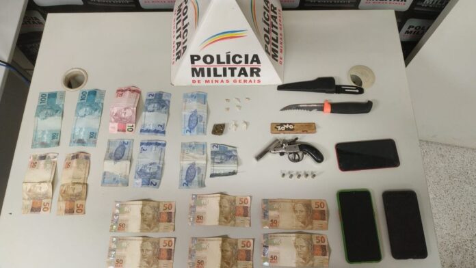 Eles foram encaminhados até a Delegacia de Polícia Civil de plantão, juntamente com os materiais apreendidos: 01 tablete de maconha; 05 pedras de crack; 02 papelotes crack moído; 01 garrucha calibre .22; 05 munições .22 intactas; 01 faca; 622 reais; 03 aparelhos celulares sendo 2 Samsung e 1 LG.