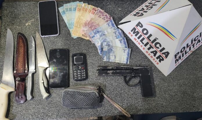 Dentro do veículo foram localizados os produtos e os instrumentos do crime, especialmente uma arma de fabricação caseira (aparentemente cal 22).