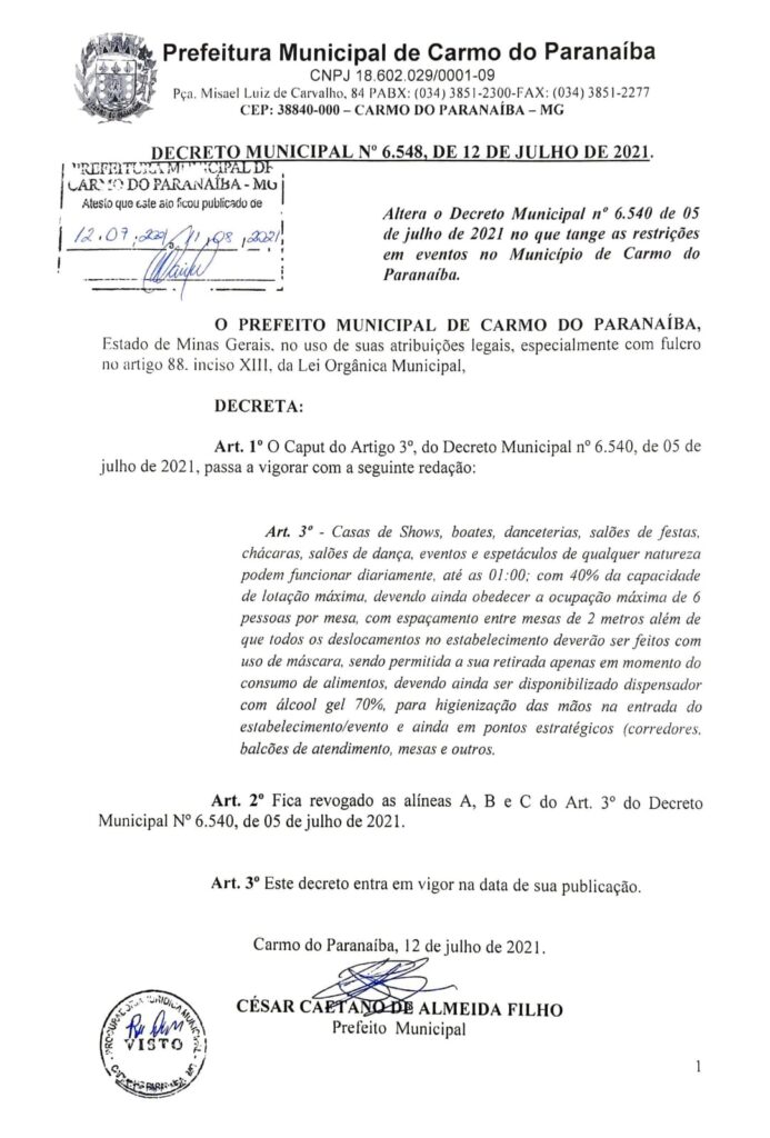 Um novo Decreto foi baixado hoje (12), em relação aos eventos no município de Carmo do Paranaíba. De acordo com ele, casas de shows, boates, danceterias, salões de festas, chácaras, salões de dança, eventos e espetáculos de qualquer natureza podem funcionar diariamente até às 01h. A capacidade é de 40% da lotação máxima, devendo ainda obedecer a ocupação máxima de seis pessoas por mesa, com espaçamento entre cada mesa de 2m de distância.