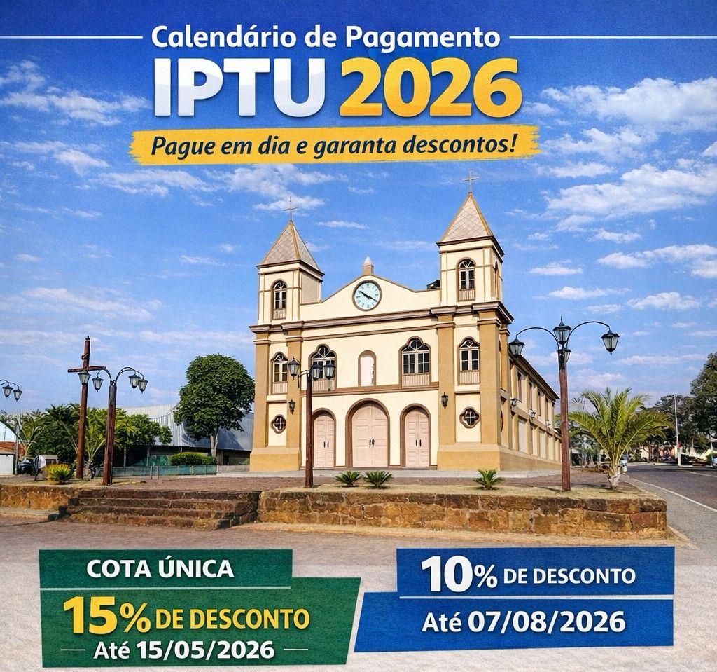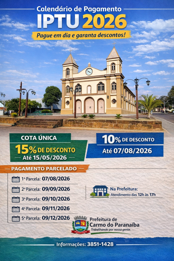 A Prefeitura de Carmo do Paranaíba informa à população o calendário oficial de pagamento do IPTU 2026. Os contribuintes que optarem pelo pagamento em cota única poderão garantir descontos especiais, conforme as datas estabelecidas.
