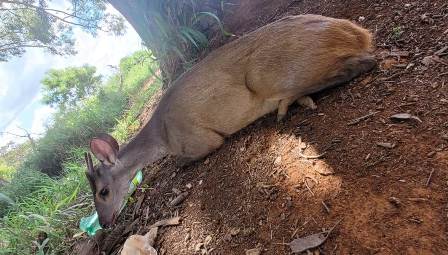 No local, em uma fazenda da região, funcionários encontraram um veado machucado em meio à lavoura. O animal, identificado como um veado-catingueiro, apresentava dificuldades para se locomover, arrastando as patas traseiras, possivelmente em decorrência de atropelamento.