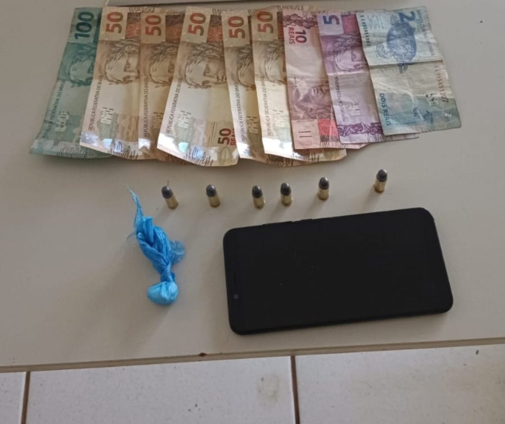 Nos bolsos da bermuda que ele usava foram encontradas seis munições, um “papelote” de cocaína, um celular e uma quantia em dinheiro. Por fim, o capturado que é natural da cidade de Jacobina, no estado da Bahia, foi conduzido para a Delegacia de Polícia Civil e entregue ao delegado de plantão.