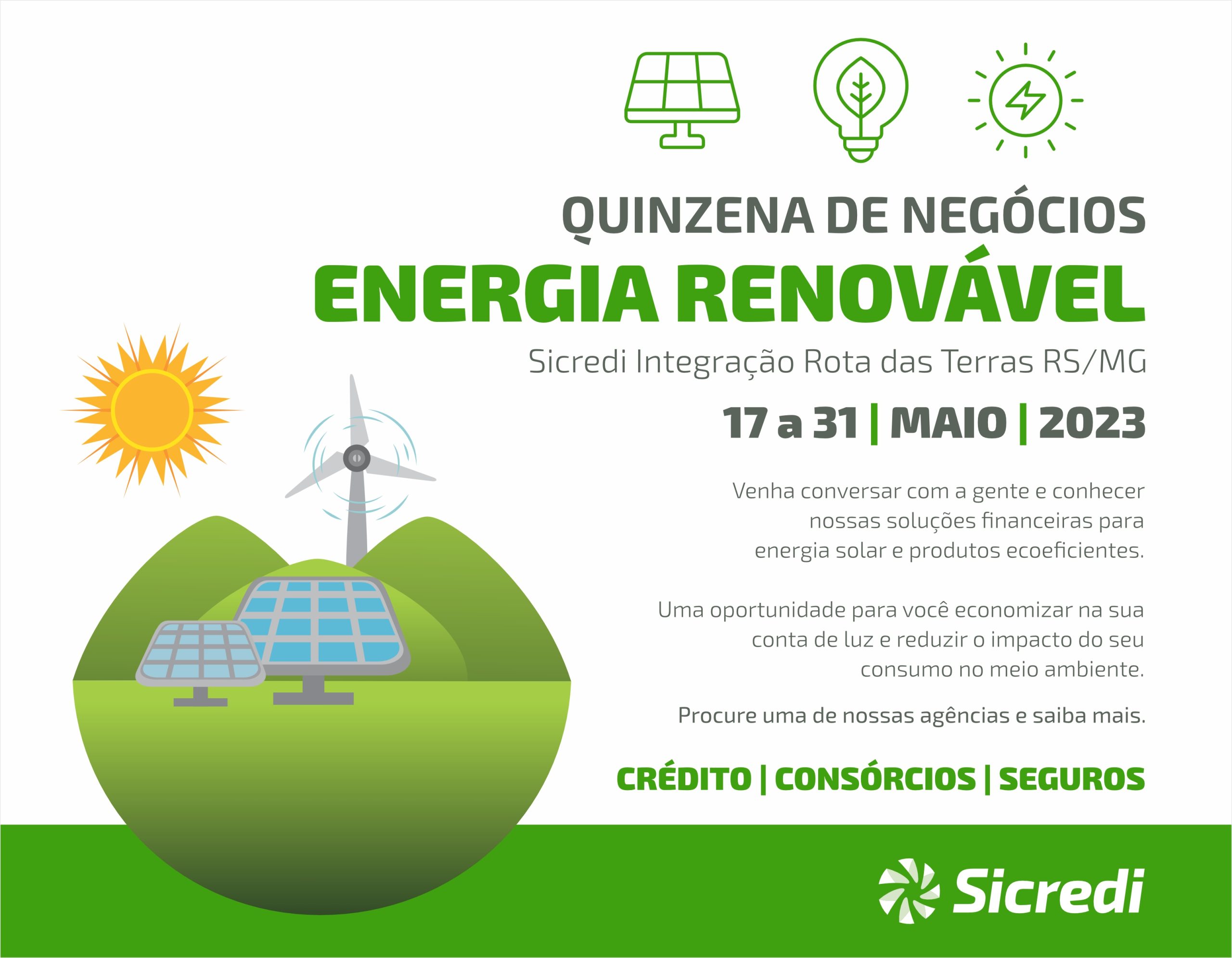 A Sicredi Integração Rota das Terras RS/MG preparou uma Quinzena de Negócios de Energia Renovável, de 17 a 31 de maio, para você negociar sua energia solar e produtos ecoeficientes.