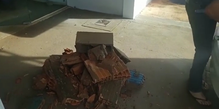 Em protesto, o cidadão pegou os entulhos, colocou no carro e seguiu até a cidade. Por fim, ele jogou os pedaços de tijolos na portaria principal da prefeitura.