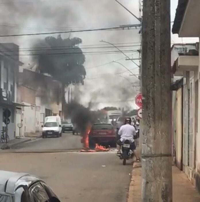 Um veículo ficou totalmente destruído depois de pegar fogo na tarde desta sexta-feira (30), no cruzamento das ruas Treze de Janeiro com a João Leandro, no centro de Rio Paranaíba.