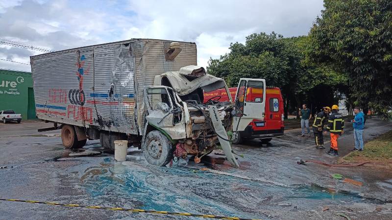 Rodocaçamba e caminhão baú se envolvem em acidente na Avenida JK em Patos de Minas; duas ficam pessoas feridas