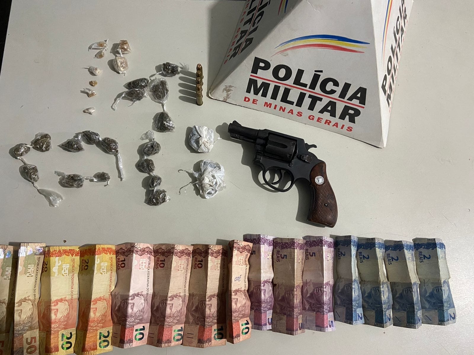 Na noite de ontem (18), em São Gotardo, durante uma averiguação de denúncia anônima sobre tráfico de drogas, um homem de 28 anos foi abordado e preso na porta da residência, no bairro São Geraldo, após ser localizado em sua posse um revólver cal 38 municiado com 5 cartuchos intactos, além de uma sacola contendo drogas ilícitas.