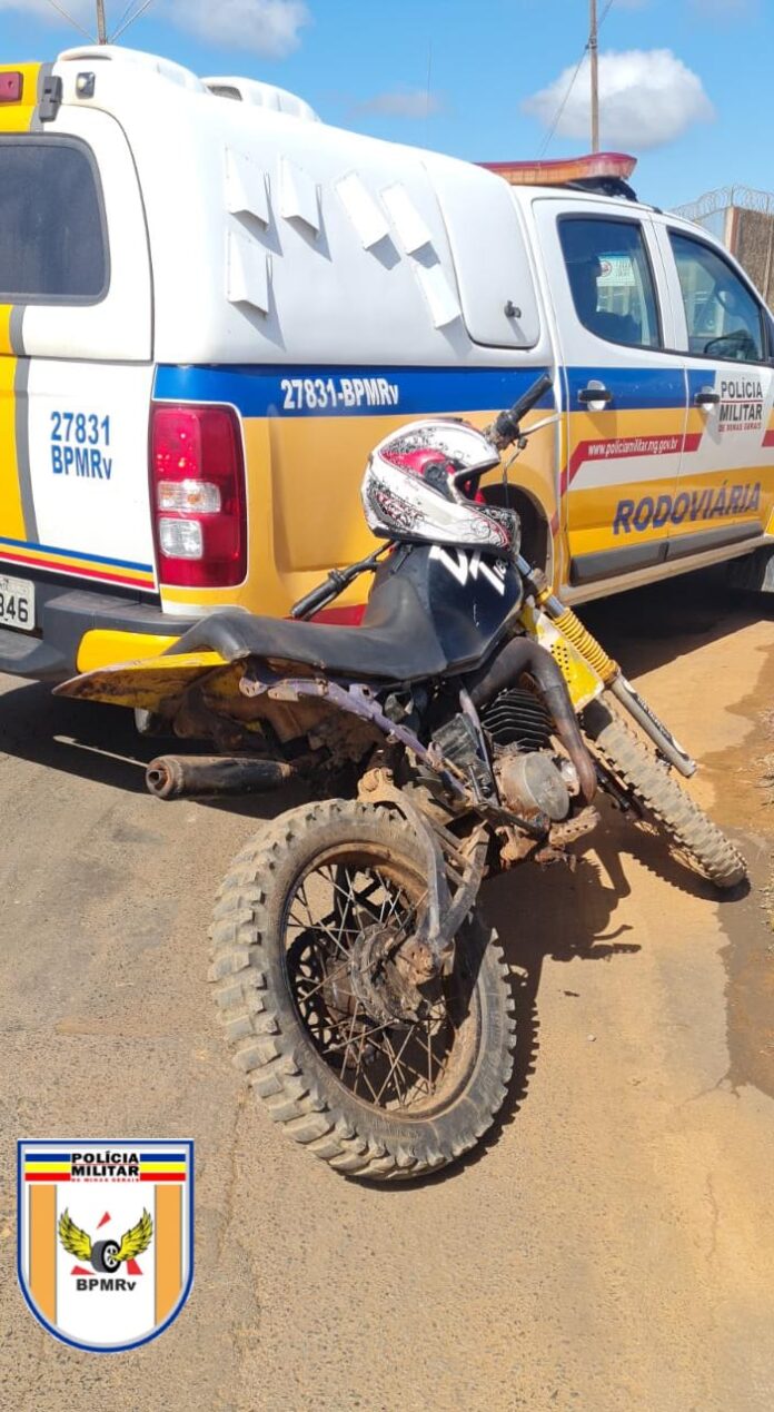A motocicleta foi abordada e, além das infrações citadas, constatou-se que o condutor (18 anos, morador de São Gotardo) não possuía CNH/PPD/ACC e o veículo estava com a marcação do Chassi adulterada, com os números suprimidos e, portanto, ilegíveis.