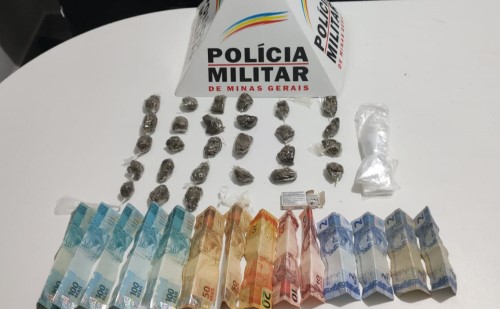 Durante a busca no local foram localizadas 27 buchas de maconha, uma pedra de cocaína e a quantia de R$648,00 em dinheiro, além de material para “dolagem” de droga.