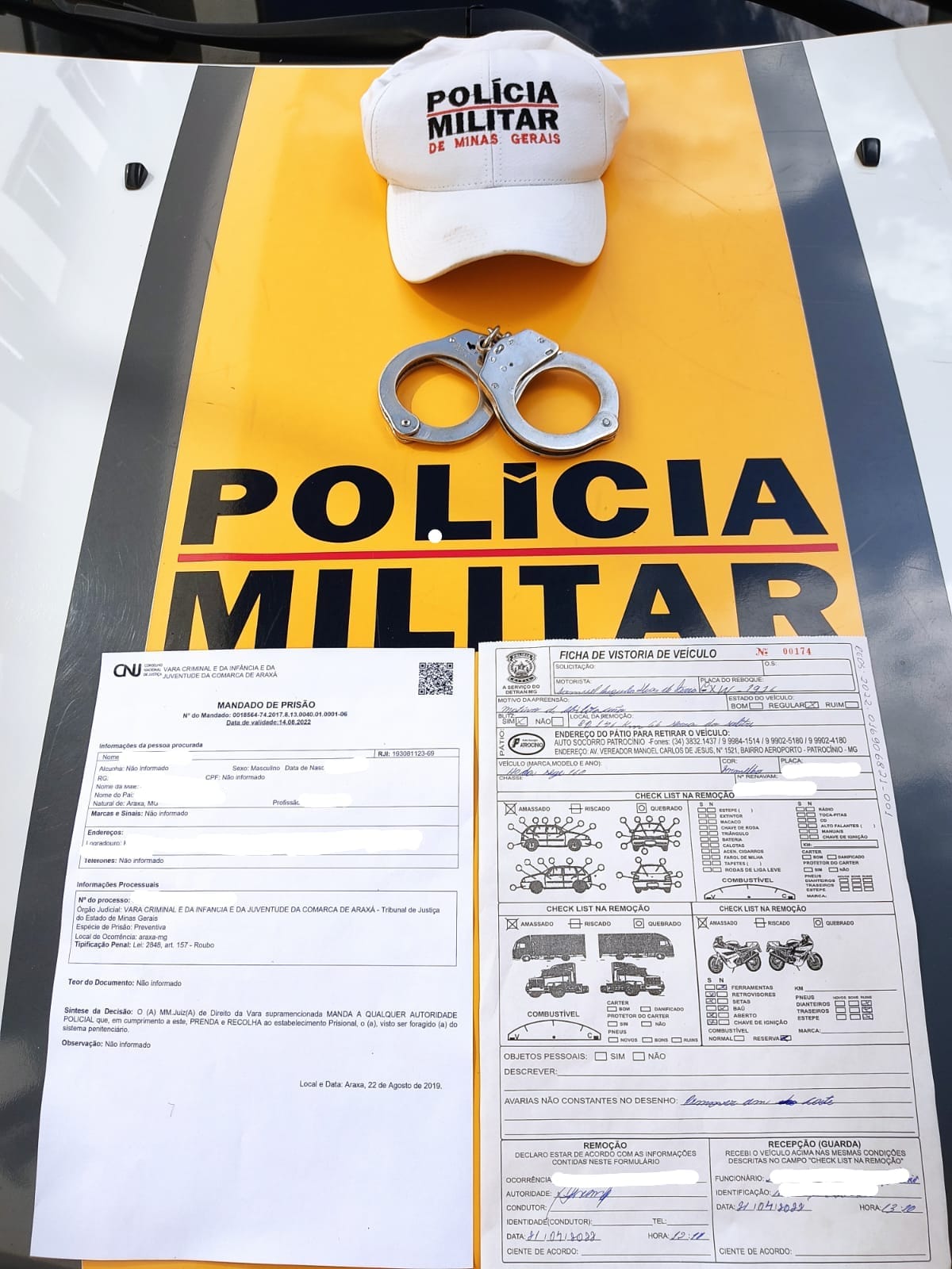 O condutor apresentou certo nervosismo com a presença policial e durante consulta em sistemas informatizados foi constatado que havia contra ele um mandado de prisão, tipificação penal Lei 2848, art. 157 (Roubo), expedido pela Comarca de Araxá em 22/08/2019, validade 14/08/2022.