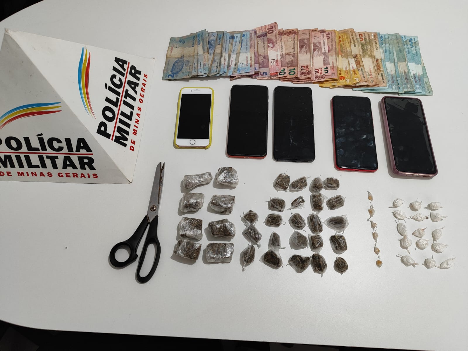 Um suspeita de 21 anos de idade e uma suspeita de 38 anos de idade foram presos juntamente com os seguintes materiais apreendidos: a quantia de R$ 2479,00 reais, 06 pedras de crack ,15 papelotes de cocaína, 31 tabletes de maconha, 01 balança de precisão, 05 aparelhos celulares e 05 ferramentas elétricas de origem duvidosa.