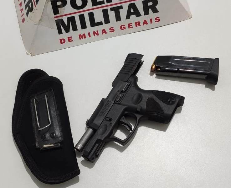 Diante das informações a guarnição deslocou ao estabelecimento comercial não encontrando o autor da ameaça, contudo o suspeito, um homem de 35 anos, compareceu posteriormente na sede do pelotão para esclarecimentos. Ele contou que tinha a posse de uma G2C 9 mm, dentro de um cofre na sua residência.