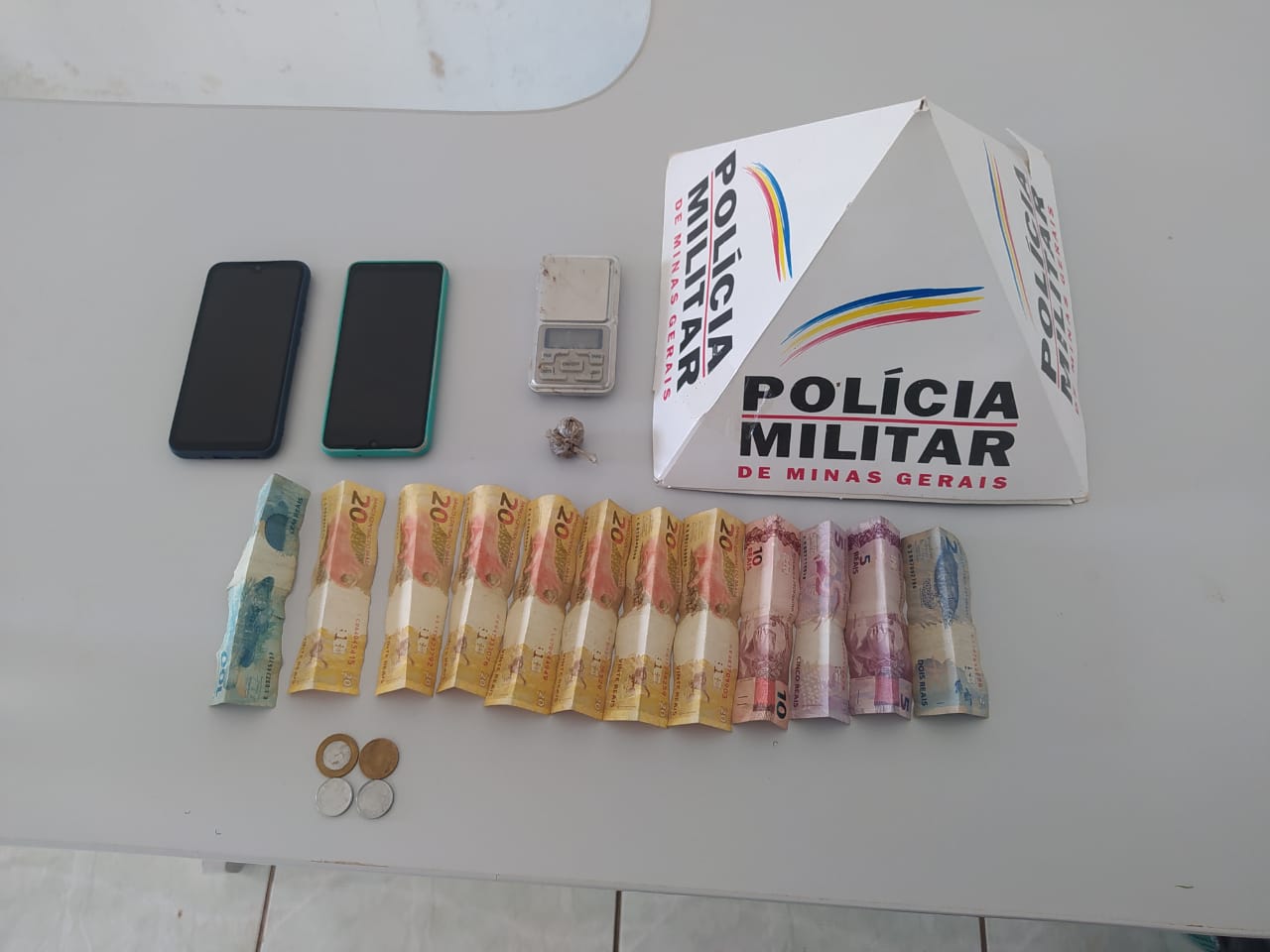 Com os suspeitos foram encontrados: uma bucha de maconha (pronta para o comércio); uma balança de precisão; R$ 264,25; dois telefones celulares e um veículo foi apreendido.