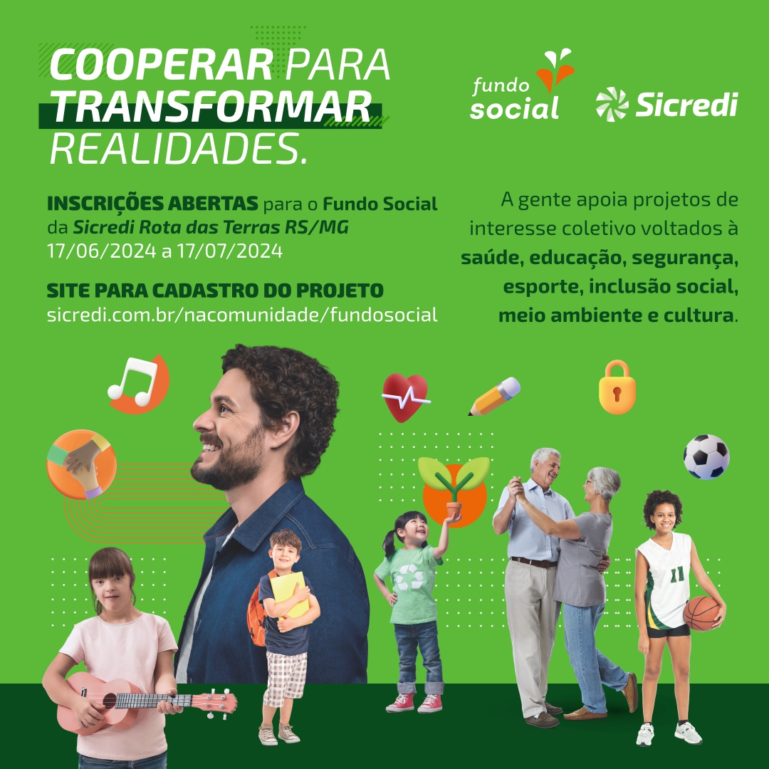 Reforçando o propósito de construir uma sociedade mais próspera, a Sicredi Rota das Terras RS/MG abre inscrições para o Fundo Social 2024, apoiando projetos sociais nos municípios da sua área de atuação e fazendo a diferença na vida das pessoas e das comunidades.