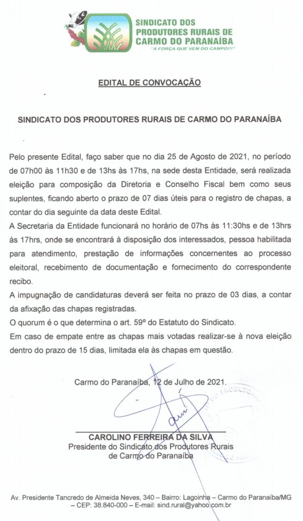 Pelo presente Edital, faço saber que no dia 25 de Agosto de 2021, no período de 07h00 às 11h30 e de 13hs às 17hs, na sede desta Entidade, será realizada eleição para composição da Diretoria e Conselho Fiscal bem como seus suplentes, ficando aberto o prazo de 07 dias úteis para o registro de chapas, a contar do dia seguinte da data deste Edital.