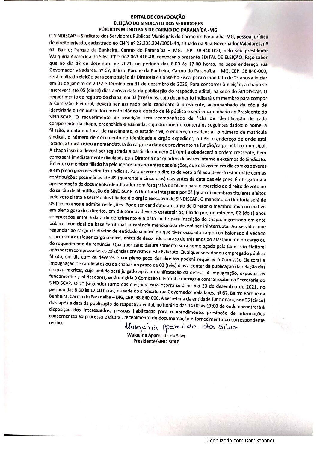 O Sindicato dos Servidores Públicos de Carmo do Paranaíba publica o Edital de Eleição que acontece no próximo dia 13 de dezembro de 2021.