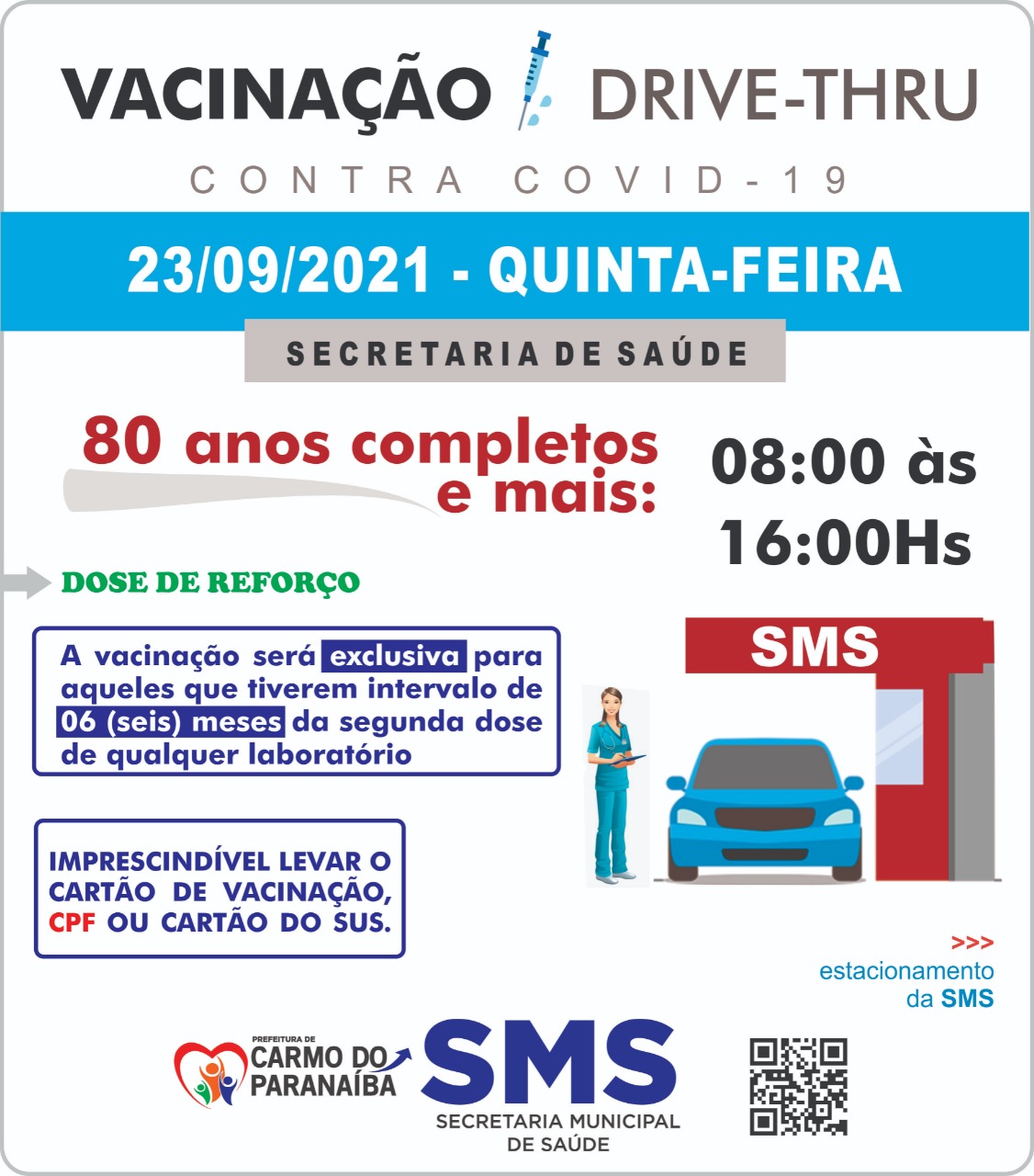 A Secretaria Municipal de Saúde (SMS) de Carmo do Paranaíba convoca idosos com 80 anos ou mais para aplicação de dose reforço de vacina contra Covid-19. A vacinação acontece na próxima quinta-feira (23), no modelo Drive-Thru, no estacionamento da Secretaria de Saúde das 08:00 às 16:00 horas. Para receber a dose reforço é necessario já ter aplicado a segunda dose a pelo menos 6 meses.