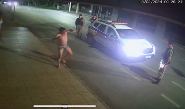A imagem mostra o suspeito, só de cueca pendurado na rede de telefonia cercado pelos militares. Ao cair no chão e tentar voltar para a casa, os militares o interceptam. Durante a abordagem, um militar sofre uma grave lesão no braço direito no momento em que o suspeito tenta fechar a porta e o vidro quebra