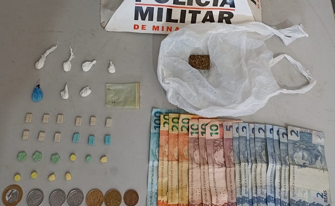 Durantes as buscas, os policiais encontraram 22 comprimidos de ecstasy, sete “dolas” de cocaína e uma bucha de maconha, além de R$ 218,00 em dinheiro.