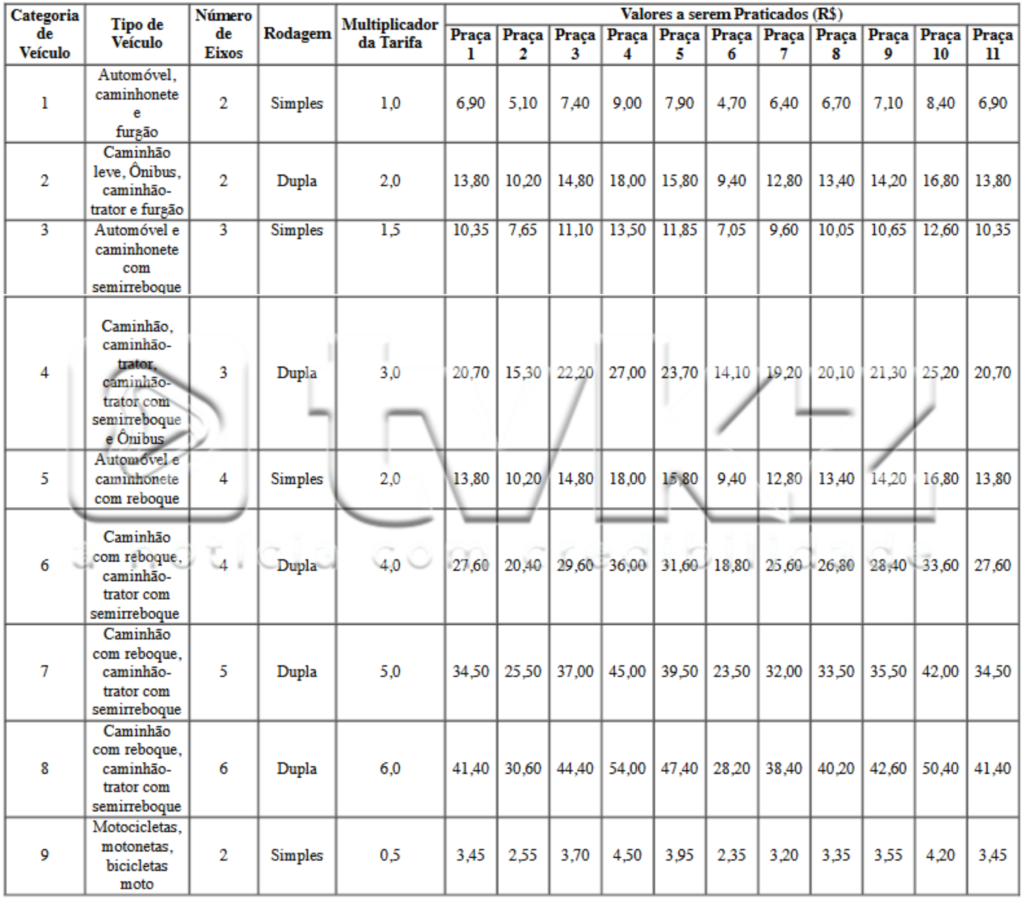 Os preços devem atingir mais que o dobro cobrado atualmente. Na praça de pedágio em Campos Altos/MG o valor terá um reajuste aproximado de 129%. Em Luz/MG será de cerca de 131%. Já em Perdizes/MG, próximo a 127%.
