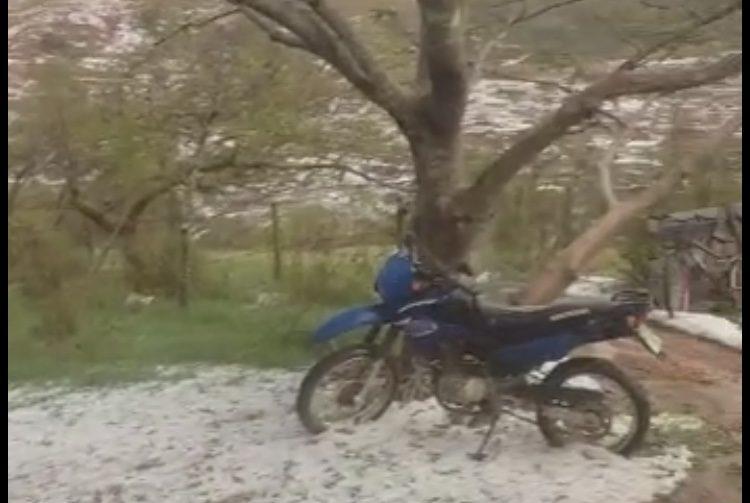 Na comunidade rural de Bebedouro, a chuva caiu forte e acompanhada de granizo. Imagens enviadas por internautas mostram as pastagens brancas, cobertas de gelo.