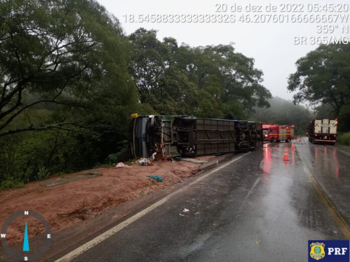 Um acidente com ônibus no km 372 da BR-365 mobilizou equipes do Corpo de Bombeiros, SAMU e até ambulâncias municipais da região. O veículo tombou na madrugada desta terça-feira (20/12) entre Patos de Minas e Varjão de Minas, no local conhecido como “Curva dos Moreiras”. Pelo menos uma pessoa morreu e várias ficaram feridas.