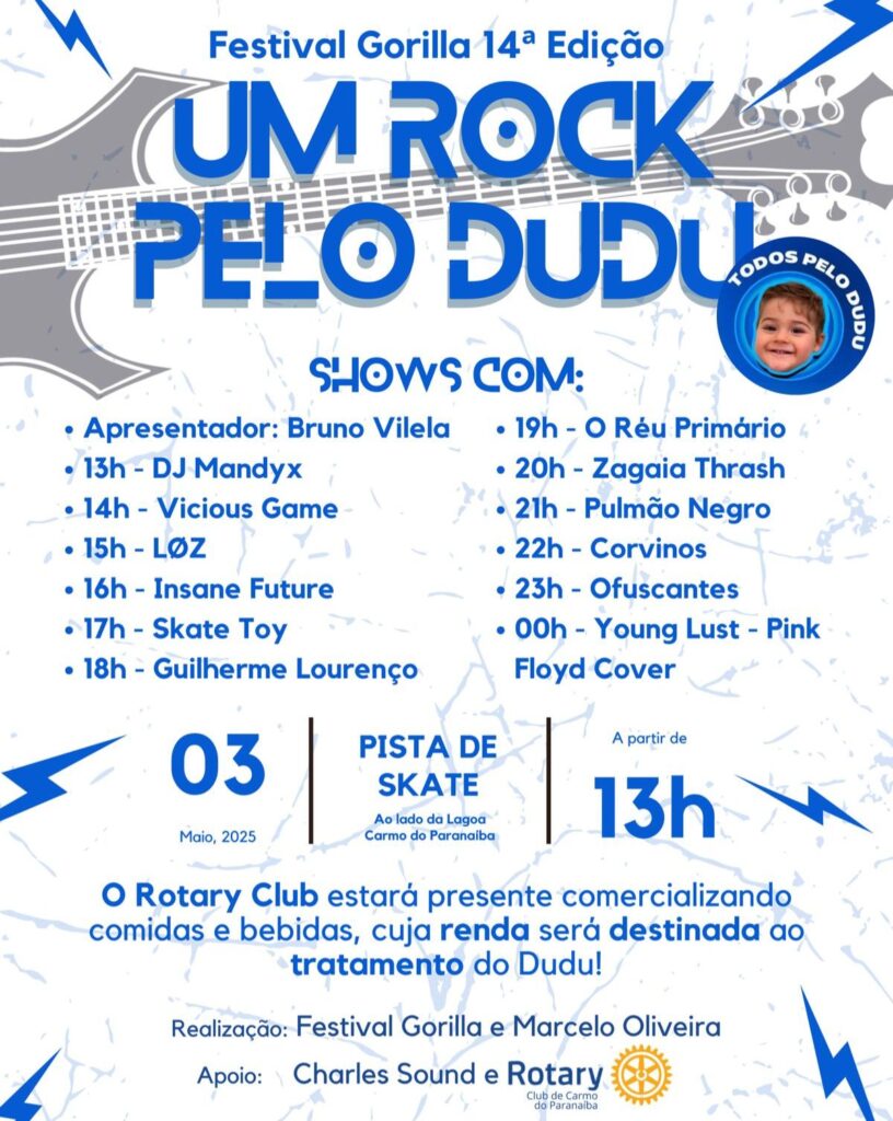 Acontece neste sábado (3/5) em Carmo do Paranaíba, a 14º edição do Festival Gorilla. O evento terá início a partir das 13h na Pista de Skate (ao lado da lagoa) com diversas atrações musicais. Neste ano, durante a realização da ação cultural, o Rotary Club estará presente comercializando comida e bebidas em prol da cura para o Dudu.