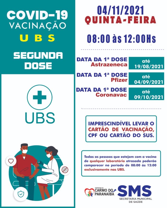 A Secretaria Municipal de Saúde realizará nesta quinta-feira (04) a aplicação de segunda dose de vacina contra COVID-19. A vacinação será realizada em todas as Unidades Básicas de Saúde, para os seguintes grupos:
