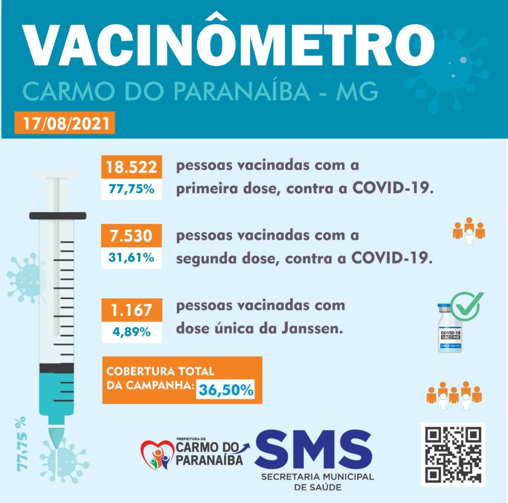 Nesta quarta-feira (17), a Secretaria Municipal de Saúde de Carmo do Paranaíba divulgou o Vacinômetro, informando 27.219 doses aplicadas.