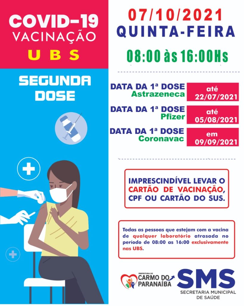 A Secretaria Municipal de Saúde de Carmo do Paranaíba informa que realizará nesta quinta-feira (07) a vacinação da segunda dose contra a COVID-19: