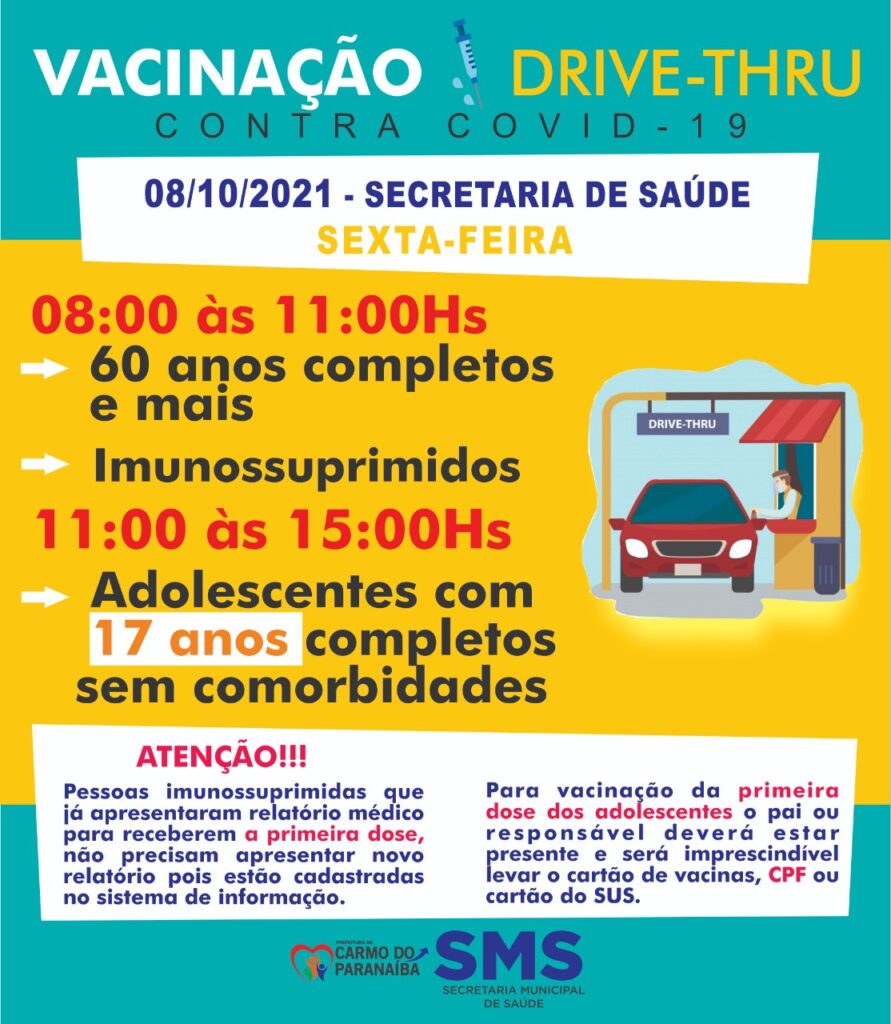 A primeira dose para adolescentes será realizada nesta sexta-feira (08), em DRIVE-THRU no estacionamento da Secretaria de Saúde para os seguintes grupos nos seguintes horários: