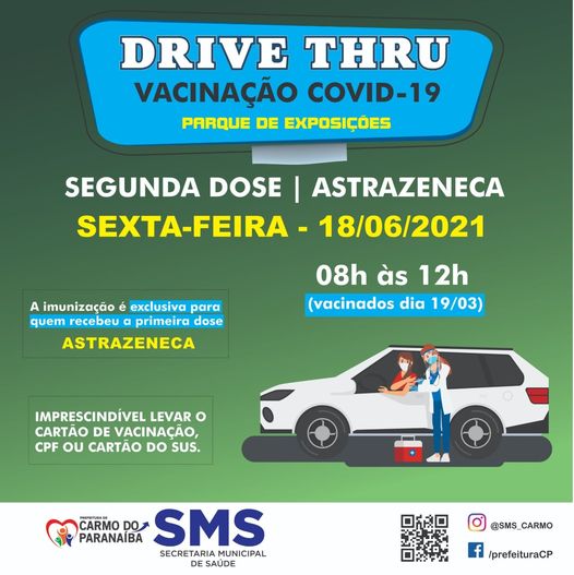Na próxima sexta-feira (18), acontecerá a vacinação da segunda dose ASTRAZENECA através do sistema Drive-Thru no Parque de Exposições de Carmo do Paranaíba.