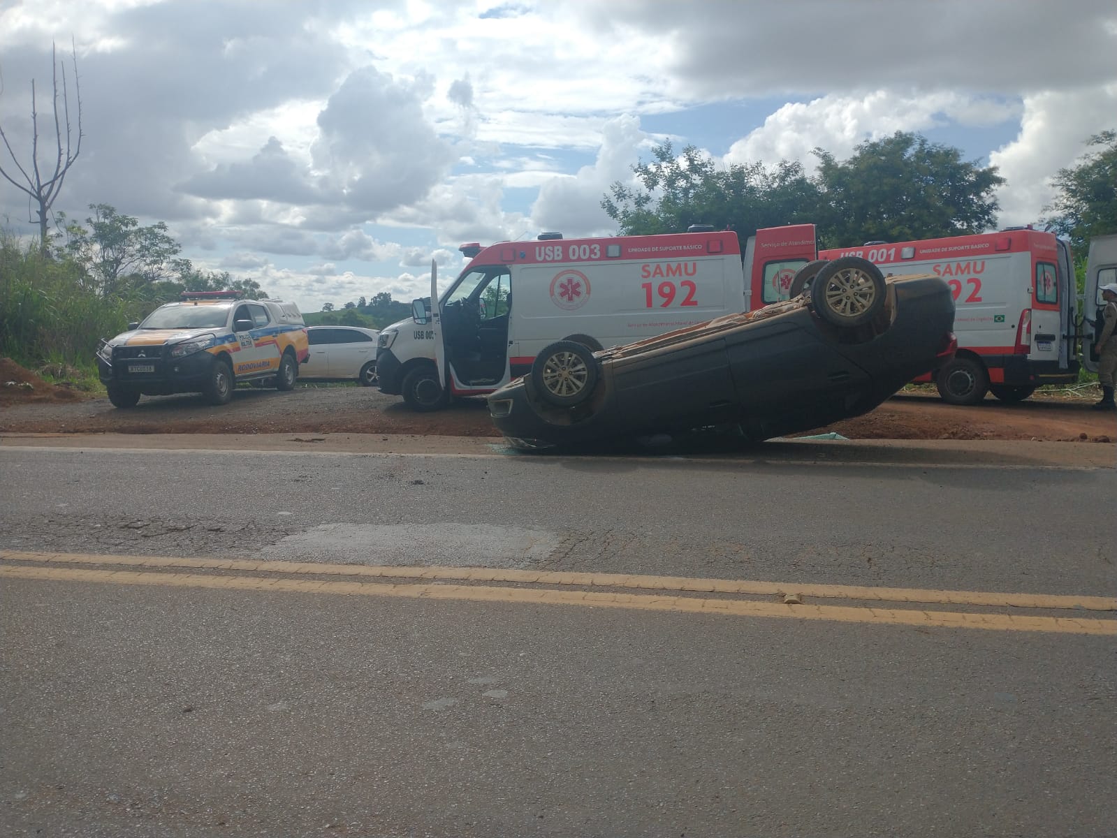 Na tarde deste domingo (01/01), a Polícia Militar Rodoviária registrou um acidente de trânsito no KM 176, da MGC-354, no município de Patos de Minas. No local, a equipe policial deparou com o veículo GM/Cobalt, cor cinza, capotado ocupando o acostamento da rodovia.