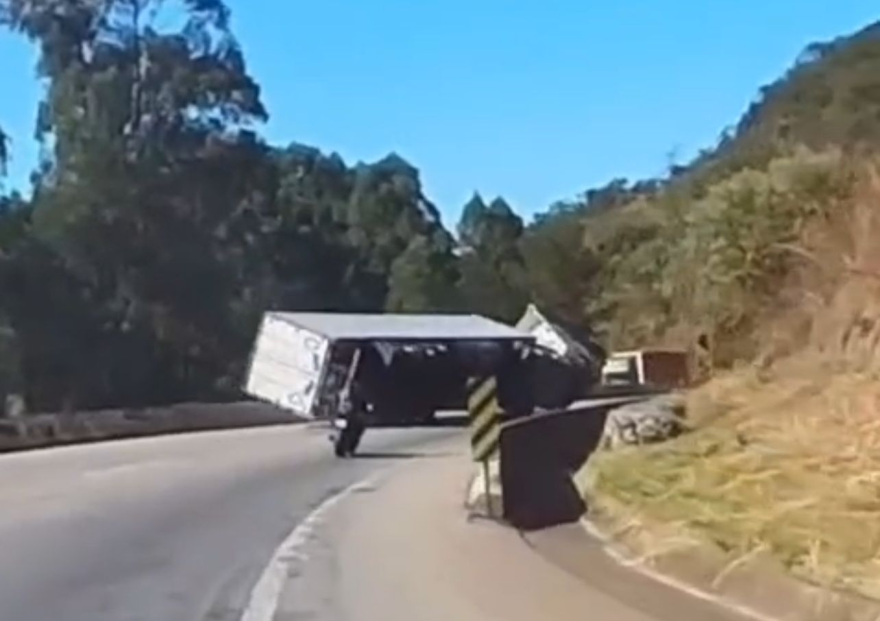 Vídeos gravados pelos motociclistas registraram o momento em que o caminhão tombou no canteiro central da rodovia ao tentar fazer uma curva.