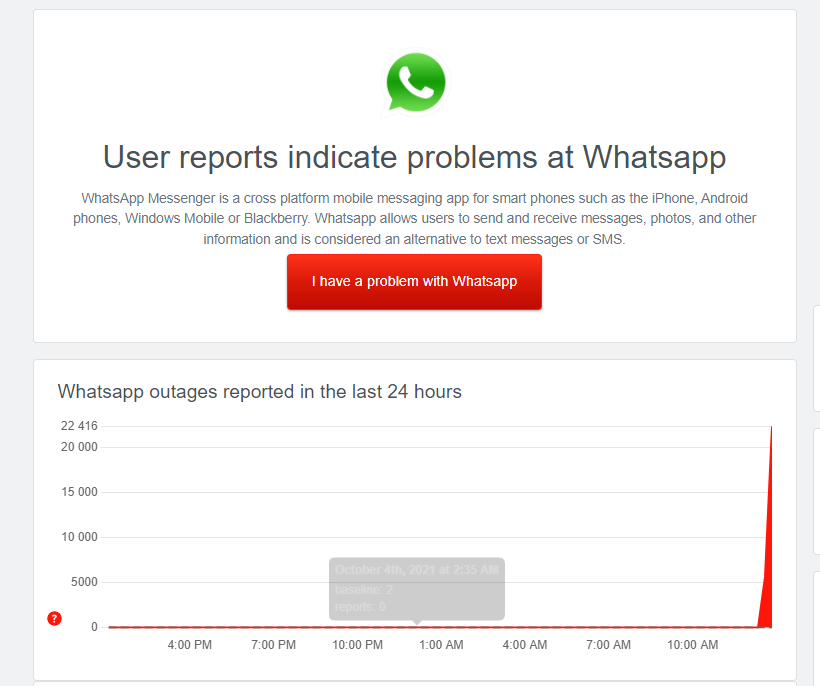 No site DownDetector, que reúne relatos de falha em aplicativos e redes sociais, há reclamações principalmente no Brasil. De acordo com o site, 38% dos problemas mais notificados no WhatsApp têm relação com o envio de mensagens, bem como no Messenger, enquanto os feeds do Instagram e do Facebook não carregam.
